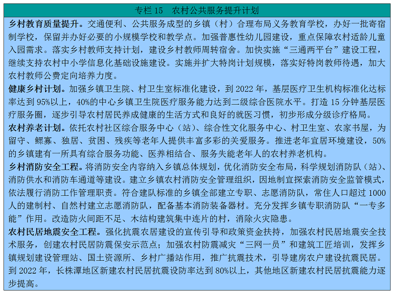 15。鞭策沉点区稳步成长。洞庭湖、湘中南的县市区,是村落复兴的沉点和从疆场。立脚农业资本丰硕、出产根本优良,成长特色劣势财产,大幅提拔农产物加工程度,加强根本设备扶植,鞭策农村财产、城乡融合成长。到2035年,根基实现农业农村现代化。